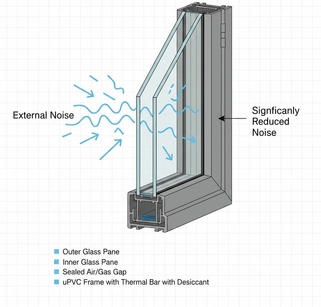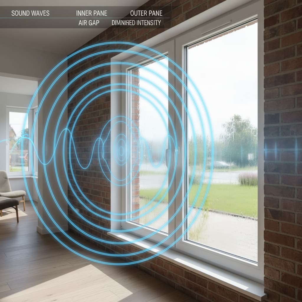 Soundproof windows work by combining two panes of glass separated by an air gap, creating a high-performance insulating layer that reduces noise transmission. The weighted sound reduction index (Rw) measures how effectively a window system can reduce noise from outside. Our double glazed windows are designed with optimal air gaps, frame design, and sound insulation materials to achieve impressive Rw ratings and significantly cut external noise.